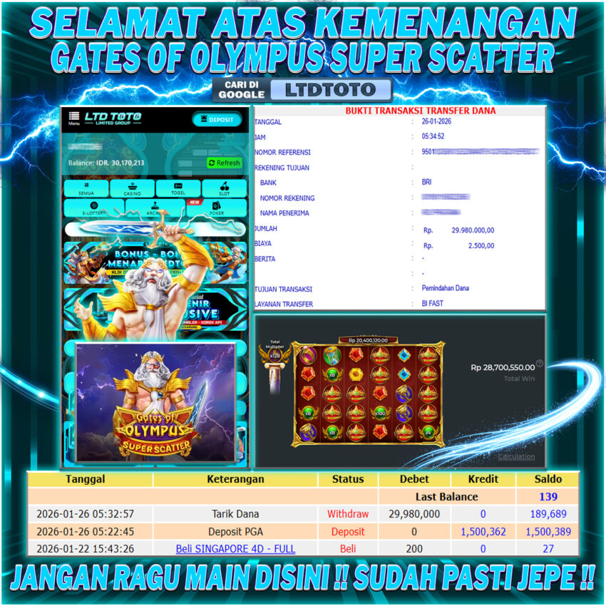 LTDTOTO JACKPOT GATES OF OLYMPUS SUPER SCATTER RP 29.900.000 SENIN 26 JANUARI 2026