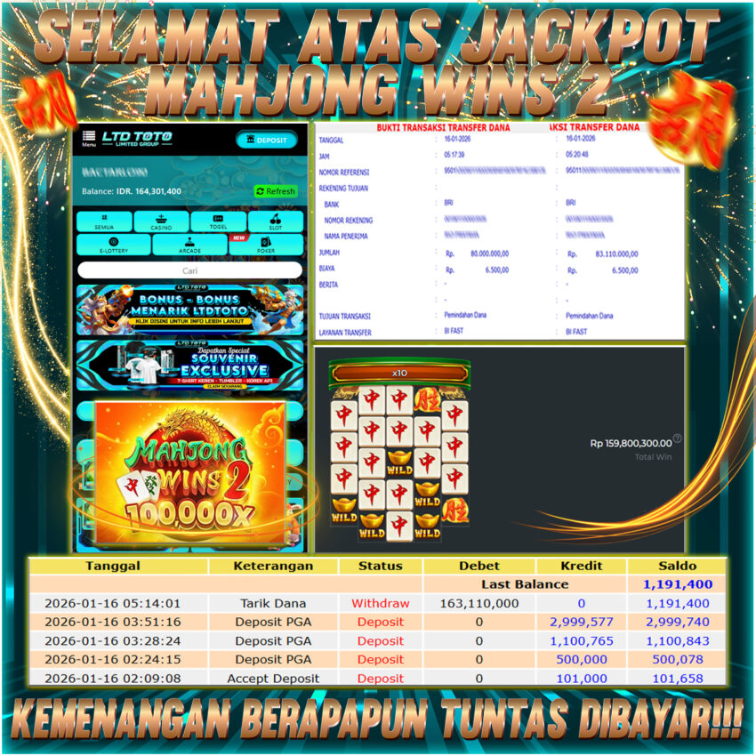 LTDTOTO JACKPOT MAHJONG WINS 2 RP 163.000.000 JUM’AT 16 JANUARI 2026