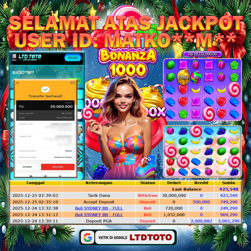 LTDTOTO JACKPOT SWEET BONANZA 1000 RP 30.000.000 KAMIS 25 DESEMBER 2025